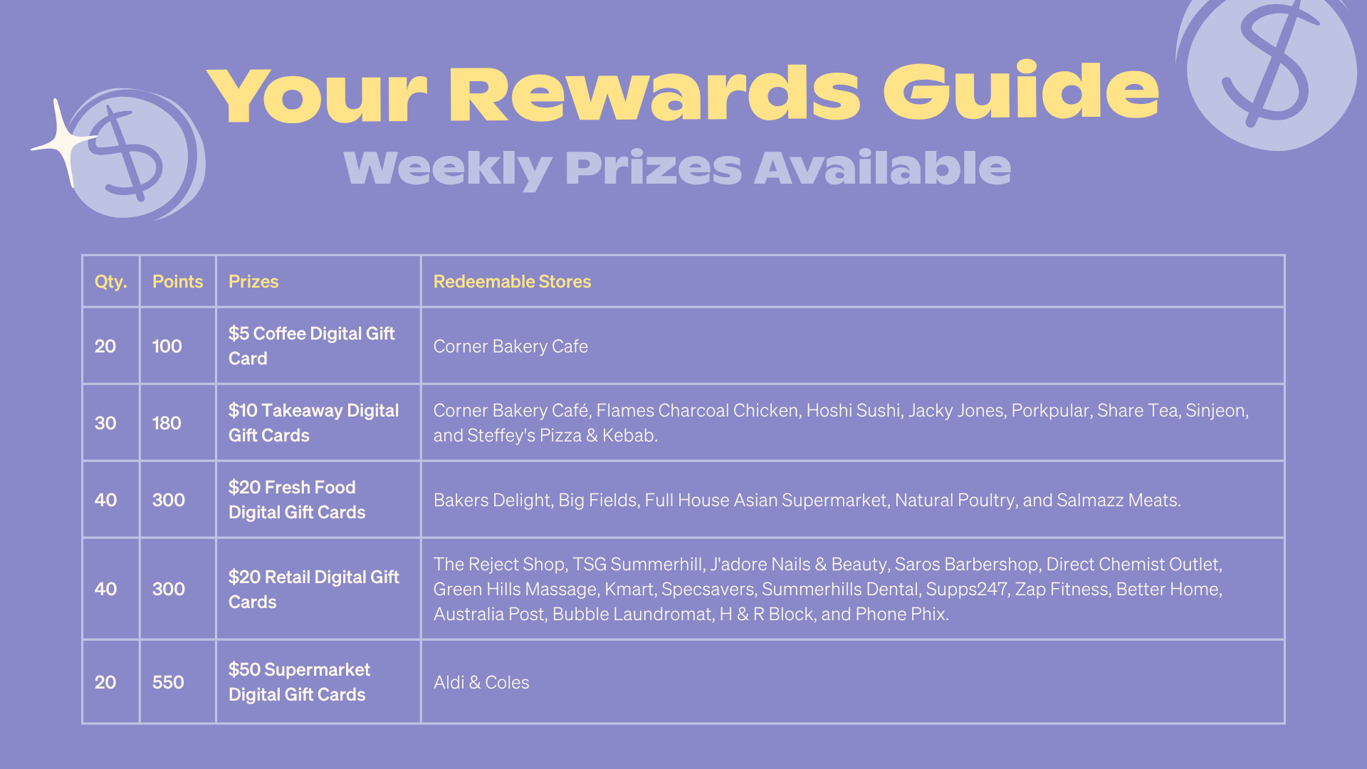 Choose from a fantastic selection of prizes, including delicious coffees, convenient gift cards, delightful lunches, and much more, all redeemable right here in the centre.